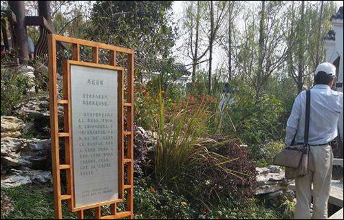 园内有一座月洞门,门边雕刻着芭蕉叶。穿门而过,脚下是一条青石板路,路面每隔大约3米,就雕刻着一句古诗,游客移步读诗,路走完,诗也读完了,颇有趣味。