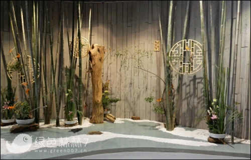 西式插花讲究造型,中式插花则强调意境。任何形式的插花作品,不论材质如何,造型如何,最终目的都是为了营造一种意境美。就像武汉园博园插花馆里这件“花好月圆”插花作品,青色的竹林,老旧的木桩,地面上碧波摇曳的水池,勾画出的是一幅清幽宁谧的竹林夜色图。月亮在竹间穿梭,林间光波轻晃,花好月圆的美好意境顿时呼之欲出。