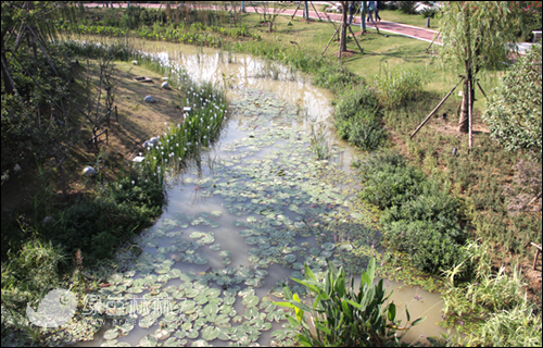 园博园整个园区的水系源头,是北区荆山峰顶的小石潭瀑布。水体喷流而下,汇集成潭,向西南蜿蜒,来到北区的生态浮桥后,与南区台地园小瀑布相接,再由小瀑布分流汇入南区湖溪。