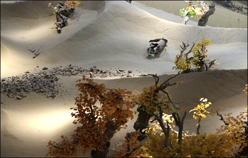 “生命之舟”紧邻“湖北小馆”,是一片上千平方米的“室内沙漠”。走进馆内,只见黄沙之中,一株株虬曲苍劲的胡杨木形态各异。美丽的背景墙上,一幅10多米高,近百米长的巨大喷绘,完美呈现着美丽的大漠风光。