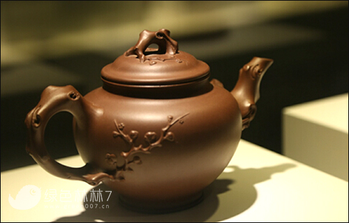 紫砂艺术展厅里就不乏各式装饰典雅的精品,将“文心”雕入紫砂表面纹理之中,让一枝寒梅傲雪绽放,让一根枯藤静看时光更迭,向你表达着自身深远的文化内涵。